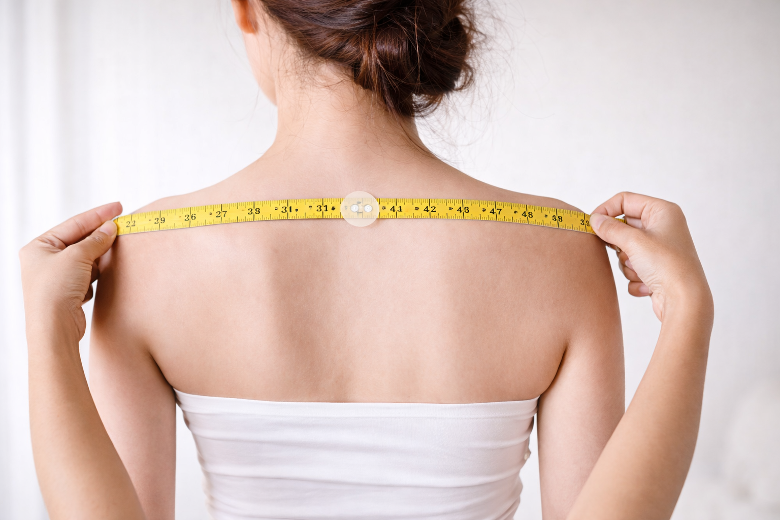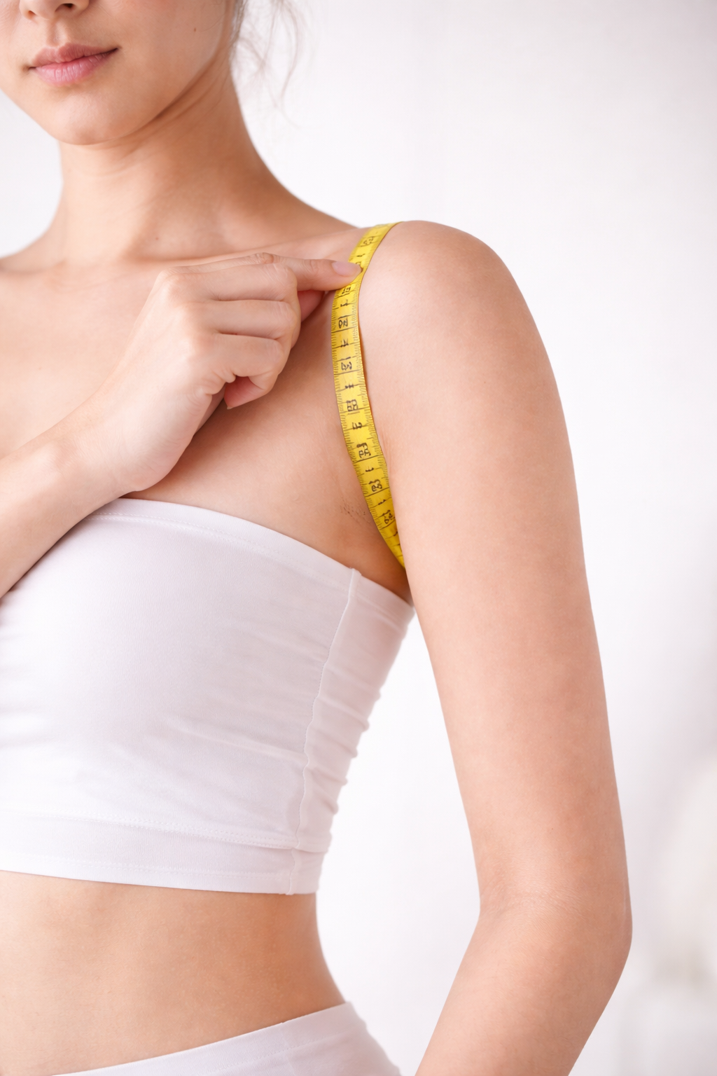 Partendo dalla parte alta della spalla fai passare il centimetro sotto l’ascella fino a ritornare al punto di partenza. Assicurati di avere il braccio disteso lungo il corpo.