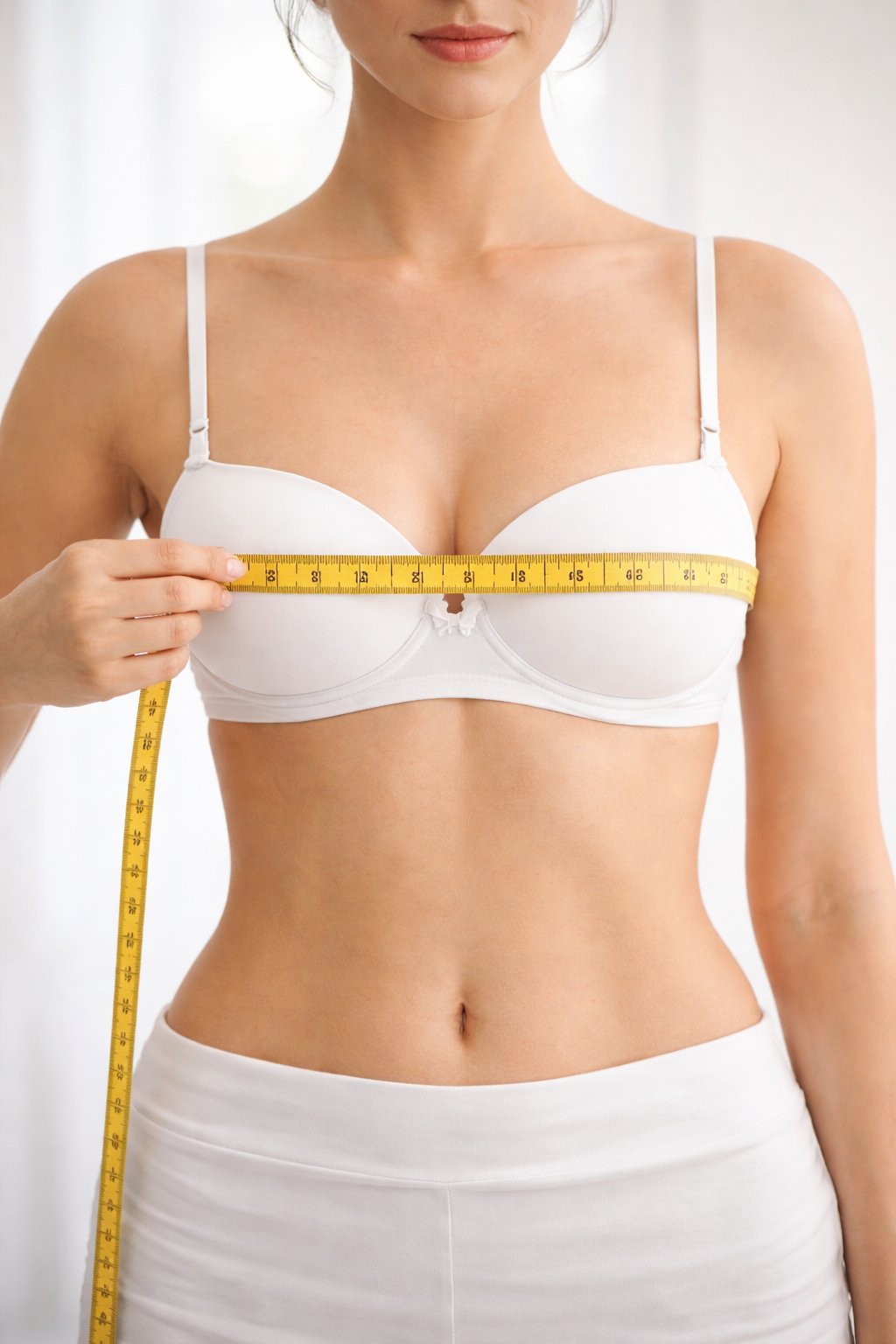 Braccia distese lungo il corpo, misura la circonferenza del busto passando dalla parte più sporgente del seno fino a tornare al punto di partenza.
