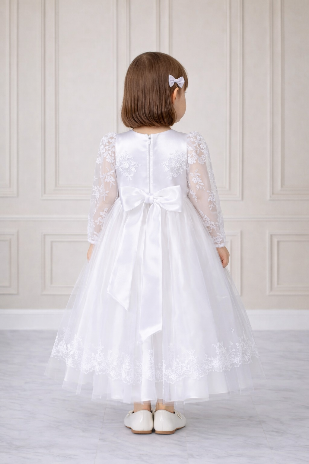 Abito battesimo bambina manica lunga in pizzo bianco con corpetto ricamato, gonna ampia in tulle e fiocco elegante sul retro. Modello raffinato e romantico per la cerimonia.