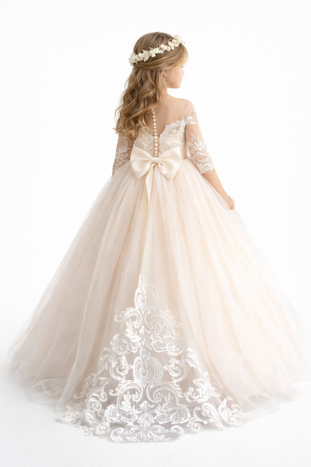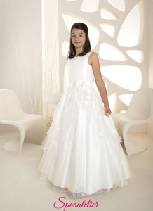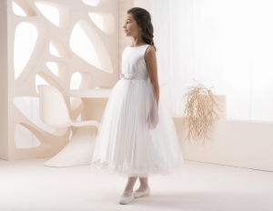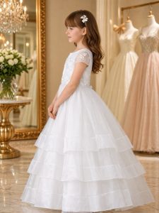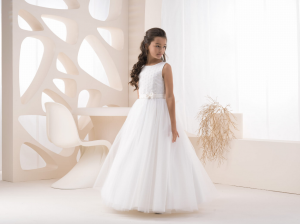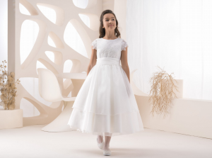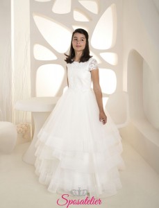 Abito Prima Comunione Principessa in Tulle con Pizzo e Maniche Lunghe
