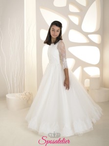 Abito Prima Comunione Principessa in Tulle con Pizzo e Maniche Lunghe