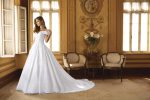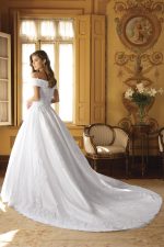 La gonna ampia scivola morbidamente creando un volume regale ma leggero. Il pizzo floreale si intensifica verso il bordo, sfociando in uno strascico romantico finemente rifinito, ideale per un ingresso trionfale in chiesa o in una location d'epoca.