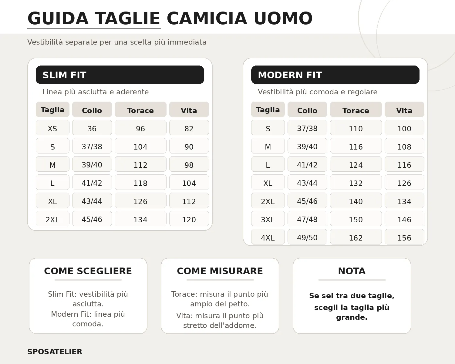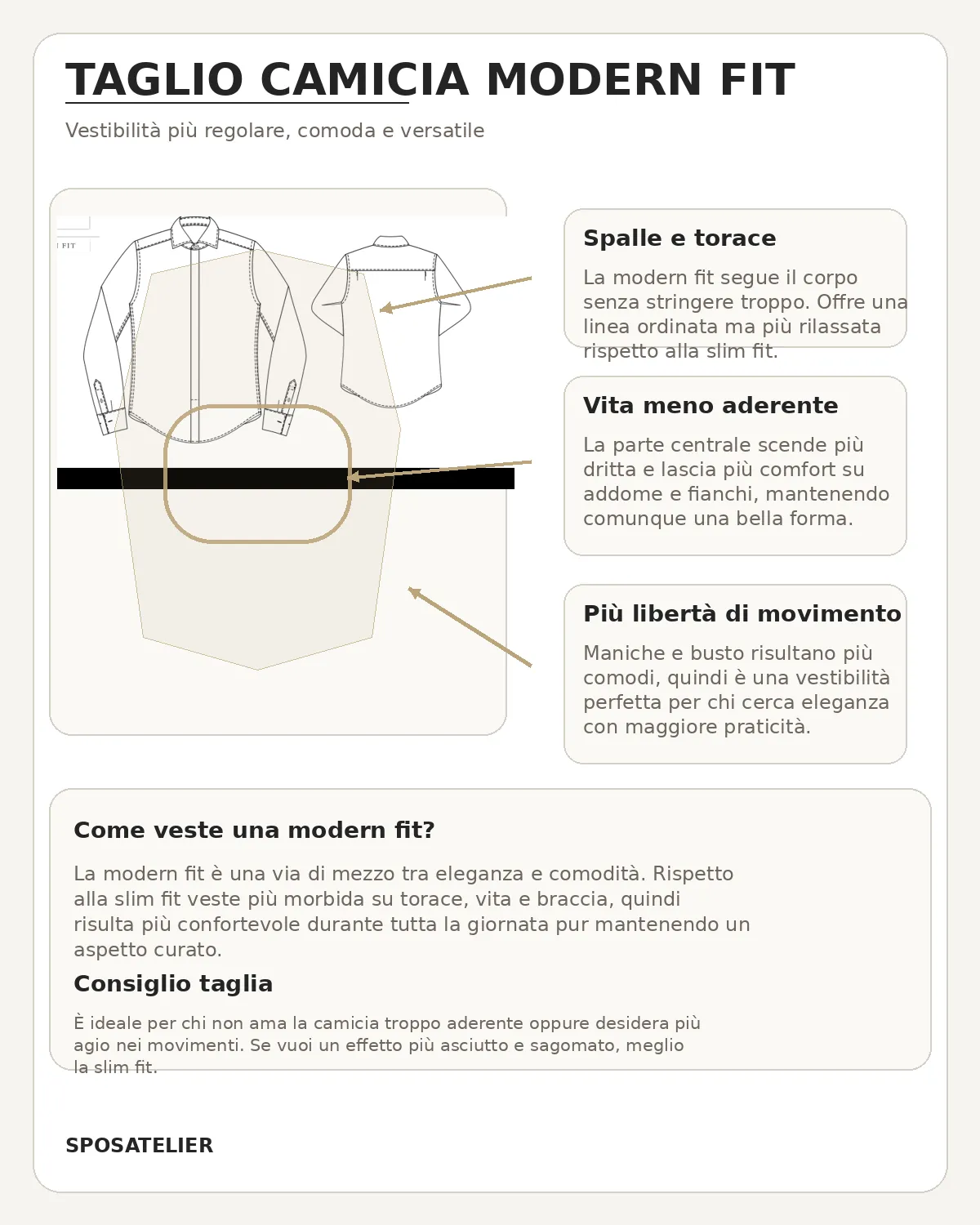 La linea modern fit offre una vestibilità più regolare rispetto alla slim fit, lasciando maggiore agio su torace, vita e braccia. Il risultato è una silhouette ordinata ma più comoda, ideale per chi desidera una camicia elegante senza un effetto troppo aderente. Grazie ai suoi dettagli sartoriali, questo modello rappresenta un’ottima base per costruire un outfit ricercato e armonioso.