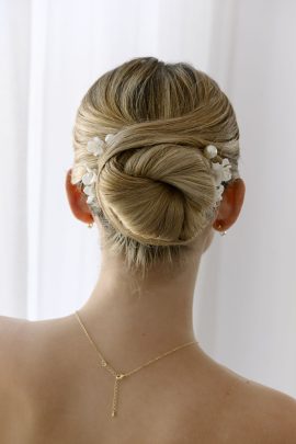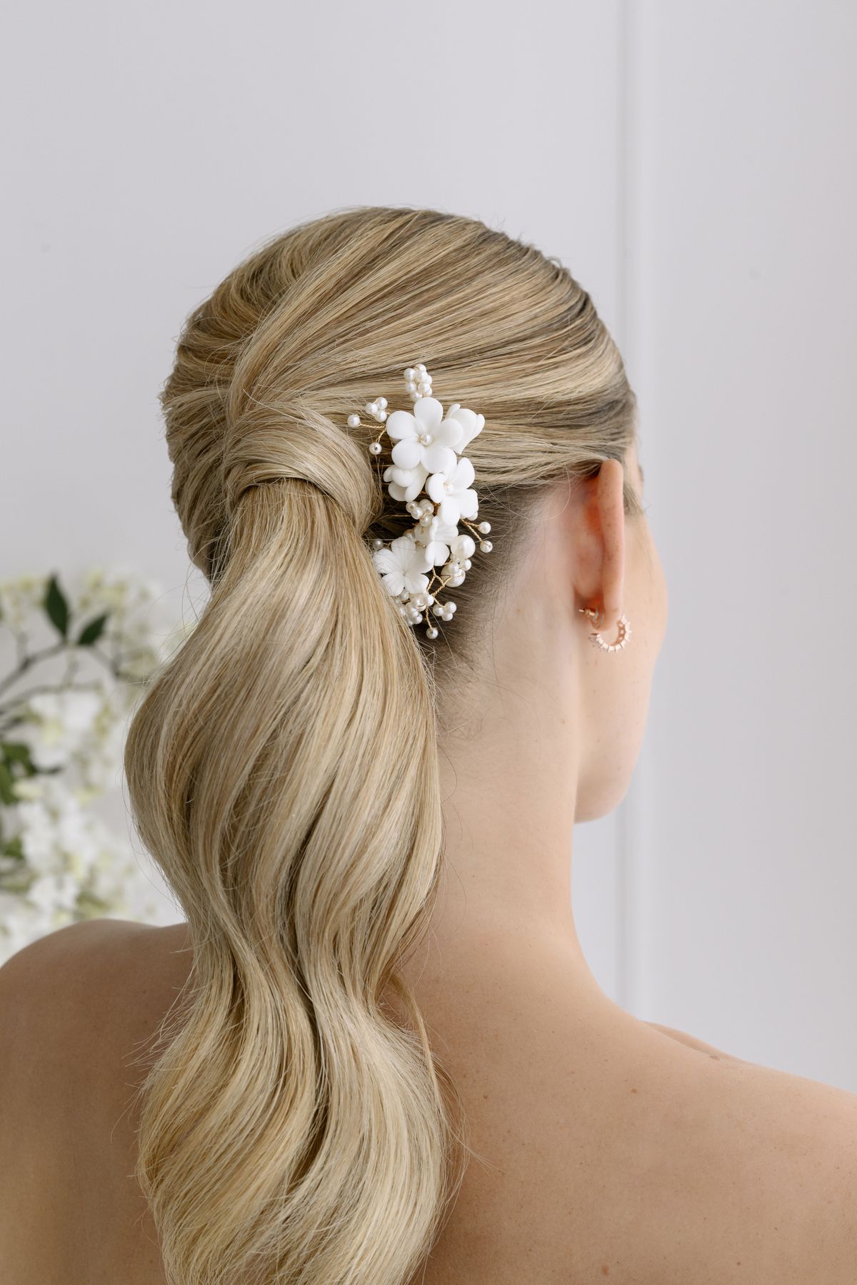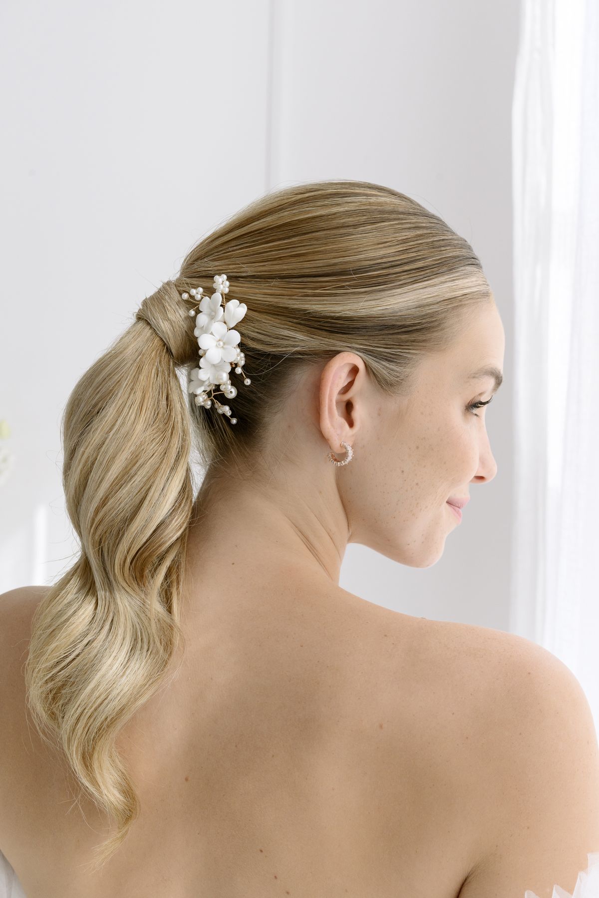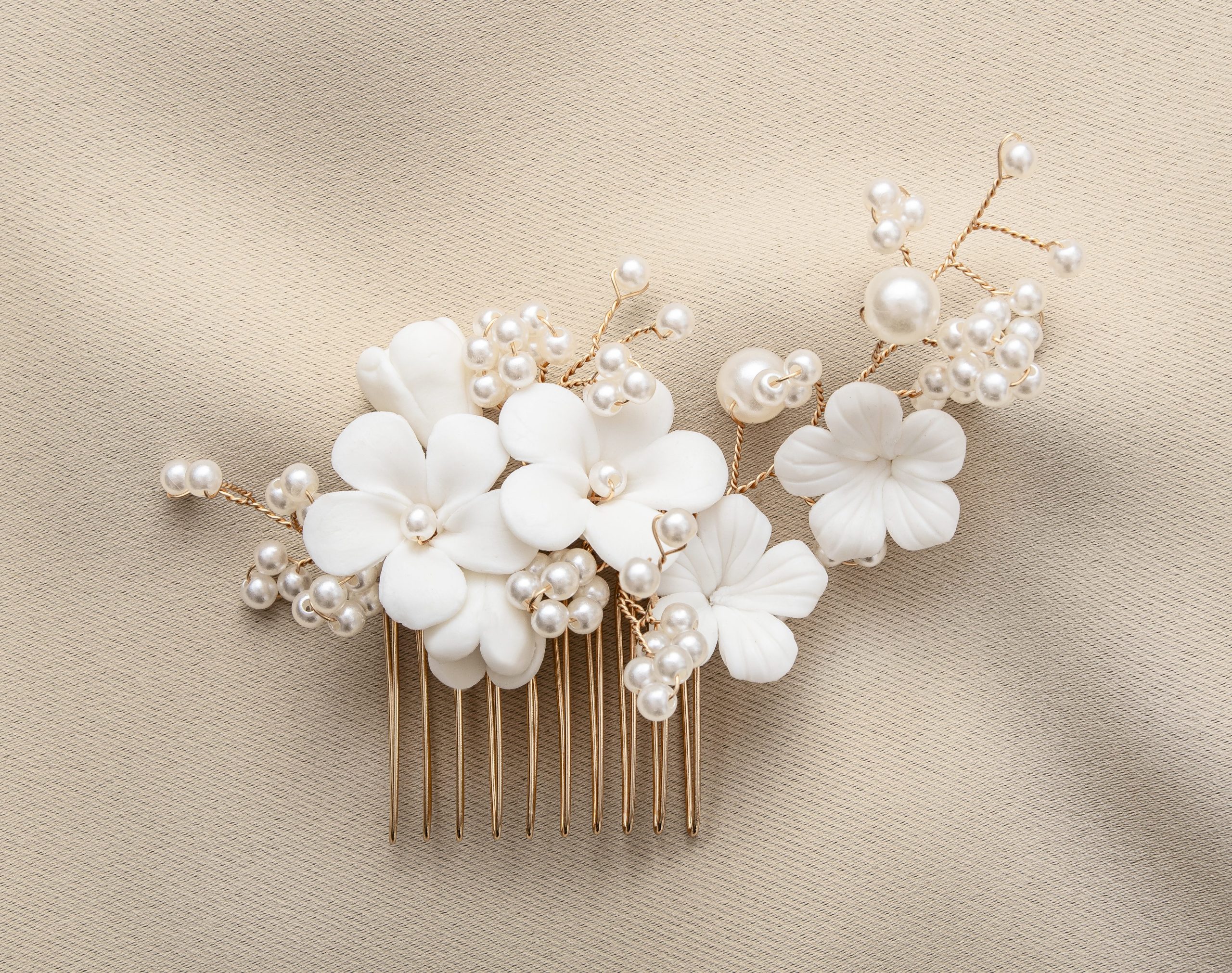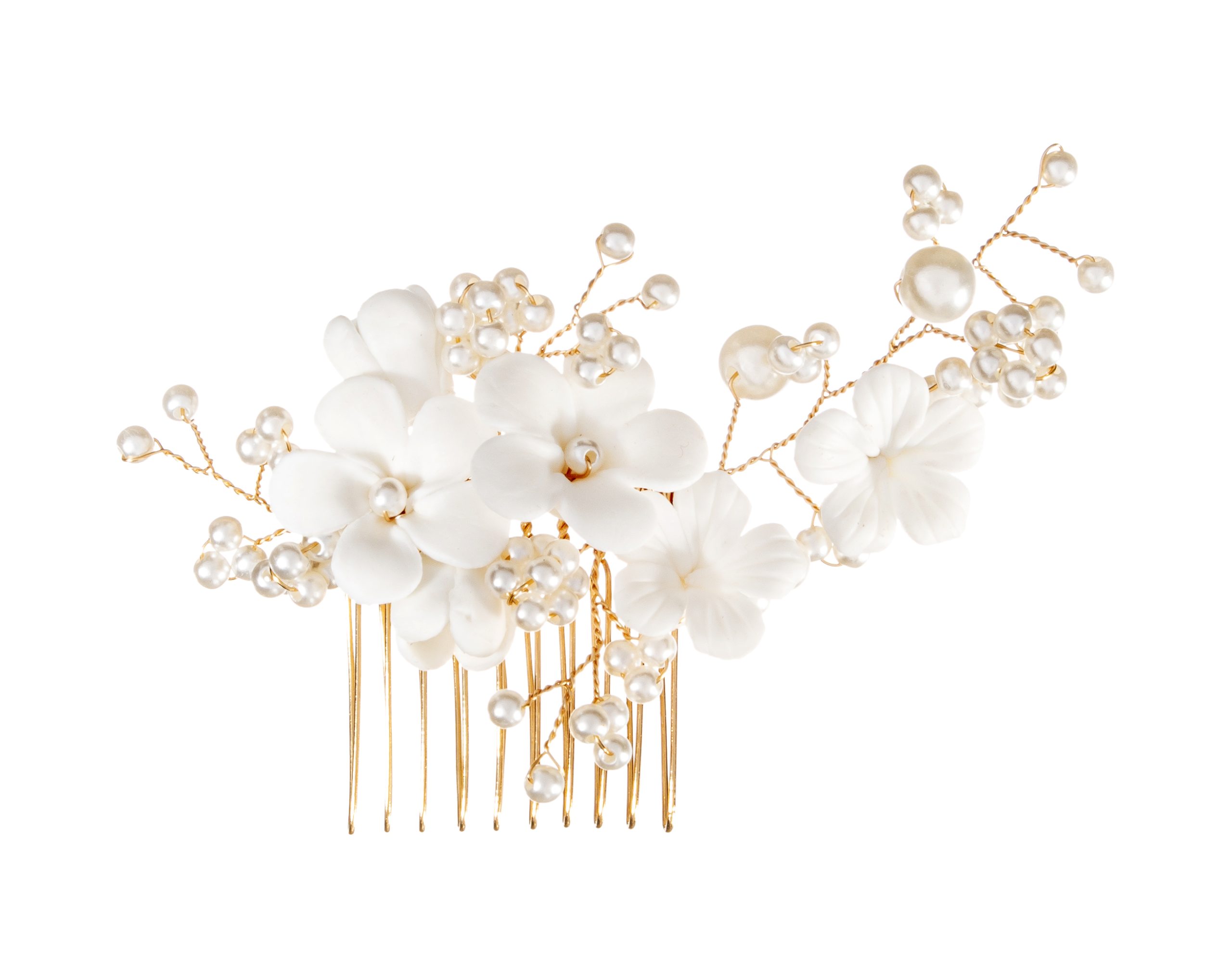 Romantico ed elegante accessorio per capelli da sposa, realizzato a mano, decorato con fiori bianchi in ceramica e perle. E' realizzato in una lega metallica anallergica (senza nichel e piombo) ed è placcato oro. Dimensioni : 5 x 11 cm.