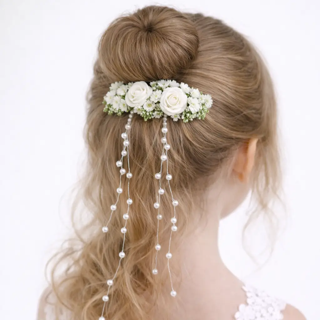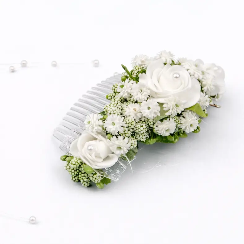 Questo accessorio per capelli รจ un vero gioiello di artigianato, pensato per chi desidera unire la freschezza dei fiori alla lucentezza classica delle perle. La struttura leggera lo rende ideale per le bambine, assicurando una tenuta perfetta senza rinunciare al comfort.