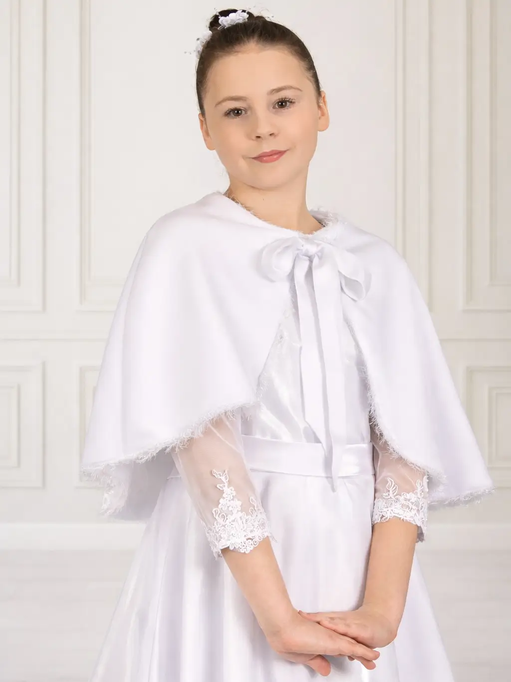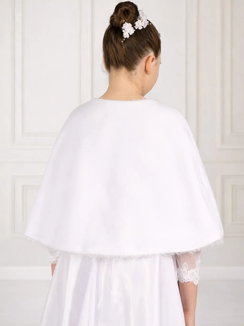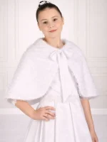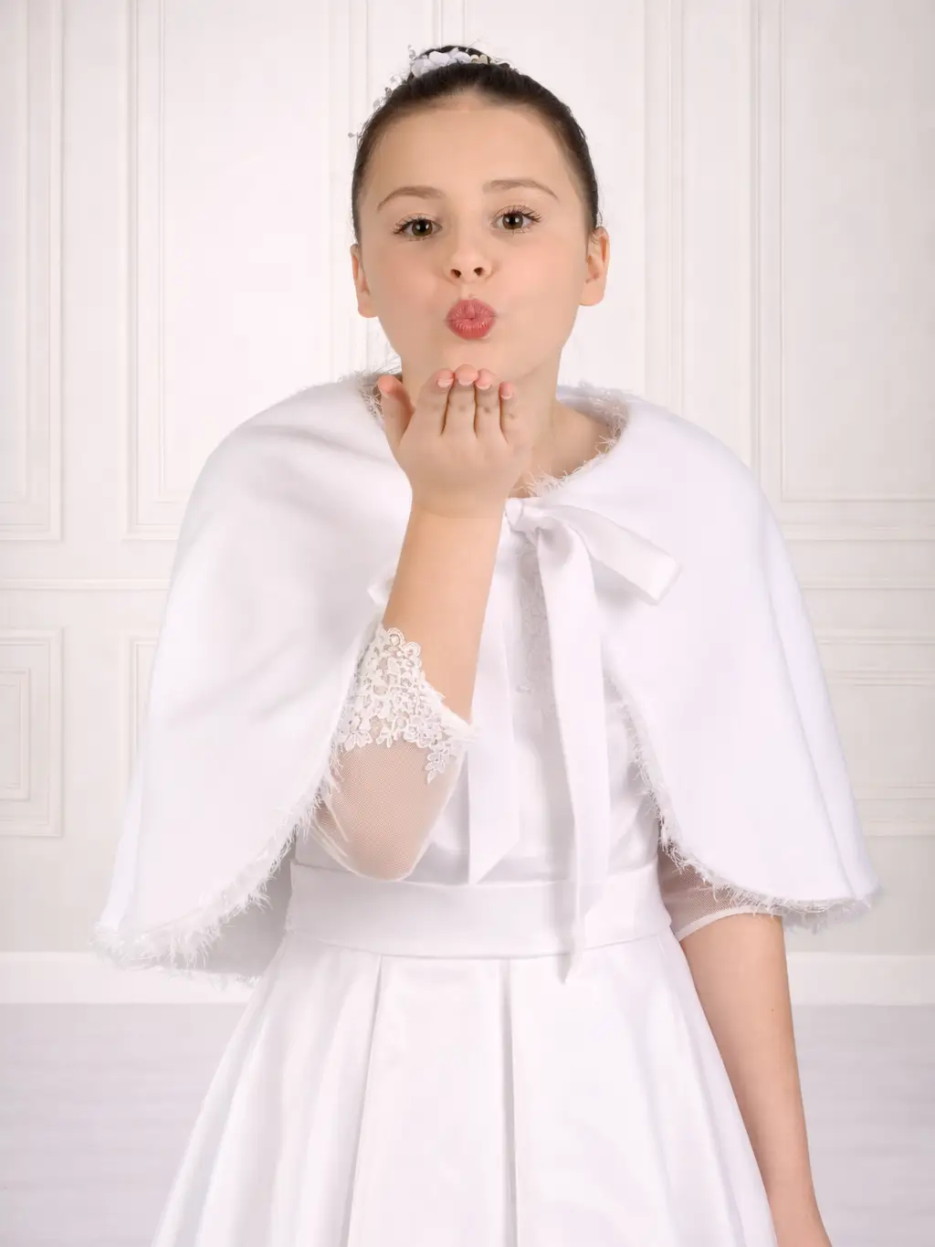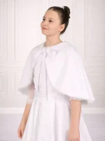 Il colore bianco o avorio e la linea raffinata la rendono un coprispalle indispensabile per completare l’outfit da comunione con sobrietà ed eleganza.